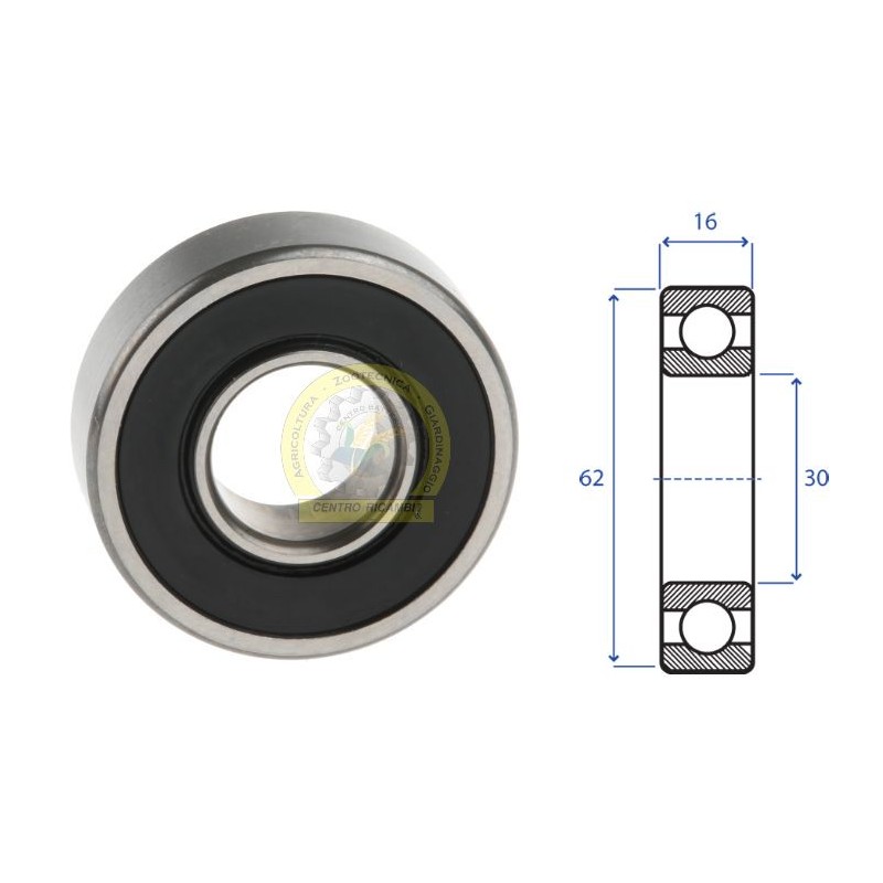 Cuscinetto radiale a sfere Dimensioni 30x62x16 mmcuscinetti rad.sfere 6206-2RS (2PZ)Codice di riferimento - 6206 - 2RS Diametro interno - d 30 mm Diametro esterno - D 62 mm Altezza - B 16 mm serie 6000 - 2RS peso netto 0.194 kg