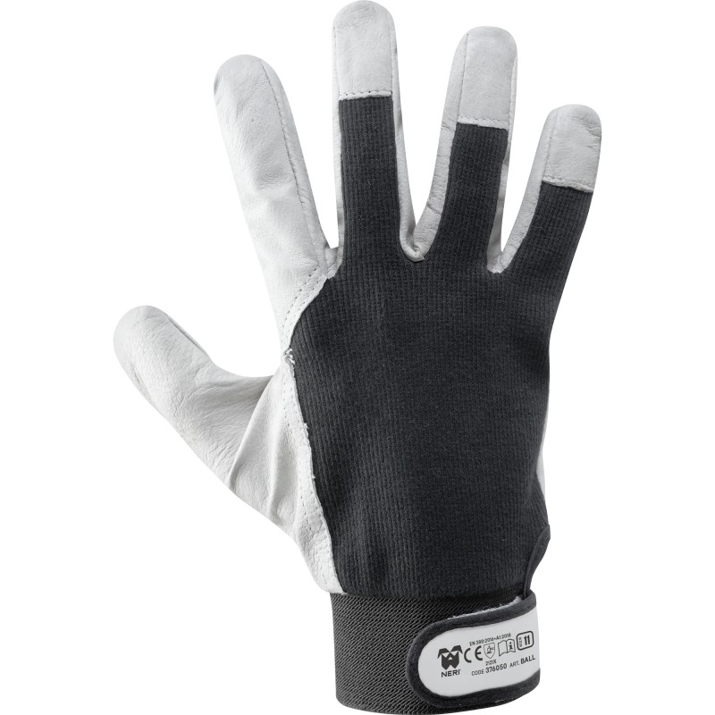 Palmo in pelle caprina Dorso in maglia di cotone elasticizzato Polso elasticizzato regolabile con velcro Colore: palmo bianco e dorso variabile in base alla taglia