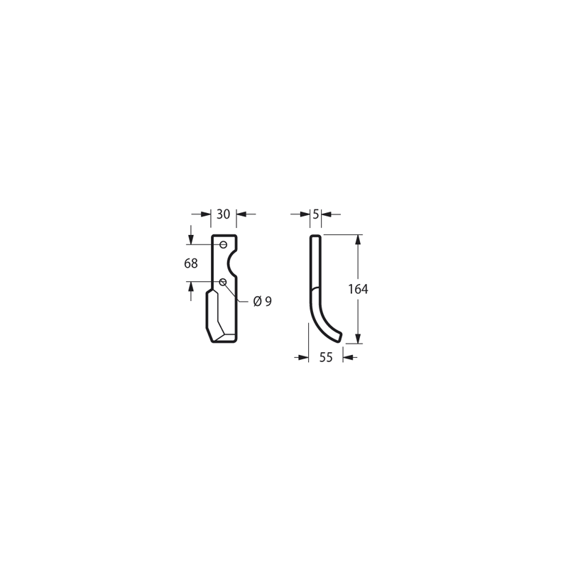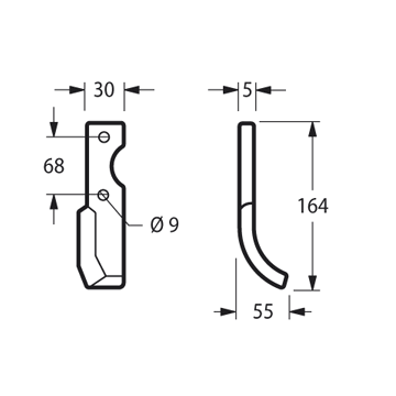Lunghezza - X 55 mm Lunghezza - Y 165 mm Larghezza piatto 30 mm Spessore piatto 5 mmForma Curva Lato Destra Diametro del foro 8.5 mm Interasse 68 mm Altro lato 55763 peso netto 0.2 kg