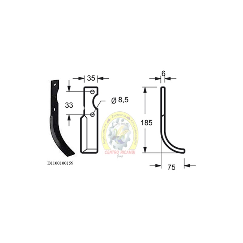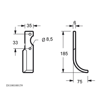 Lunghezza - X 75 mm Lunghezza - Y 185 mm Larghezza piatto 35 mm Spessore piatto 6 mmForma Curva Lato Sinistra Diametro del foro 8.5 mm Interasse 33 mm Altro lato D1100100159peso netto 0.25 kg