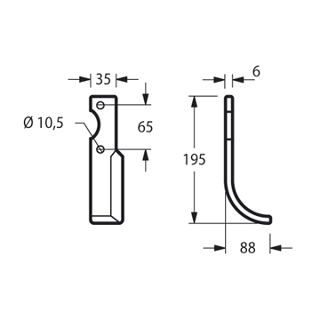 Zappa curva sinistra Diametro del foro 10.5 mm Interasse 65 mm Piatto 35x6 mmLunghezza - X 88 mm Lunghezza - Y 195 mm Larghezza piatto 35 mm Spessore piatto 6 mmForma Curva Lato Sinistra Diametro del foro 10.5 mm Interasse 65 mm Altro lato D1100100200peso netto 0.35 kg