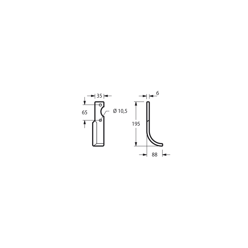 Zappa curva destra Diametro del foro 10.5 mm Interasse 65 mm Piatto 35x6 mmLunghezza - X 88 mm Lunghezza - Y 195 mm Larghezza piatto 35 mm Spessore piatto 6 mmForma Curva Lato Destra Diametro del foro 10.5 mm Interasse 65 mm Altro lato D1100100199 peso netto 0.35 kg