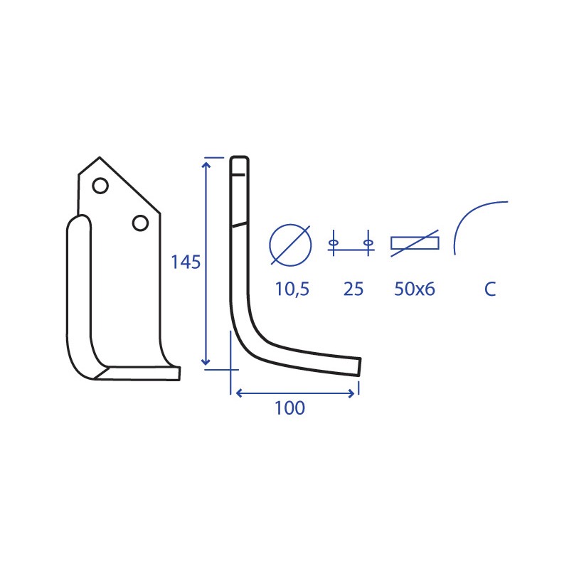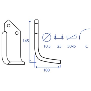 Zappa curva destra Diametro del foro 10.5 mm Interasse 25 mm Piatto 50x6 mm