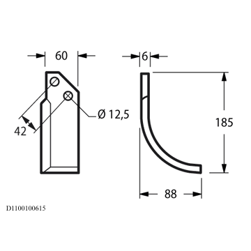 Zappa curva destraLunghezza - X 88 mm Lunghezza - Y 190 mm Larghezza piatto 60 mm Spessore piatto 6 mmForma Curva Lato DestraDiametro del foro 12.5 mm Interasse 42 mm Altro lato D1100100616peso netto 0.55 kg