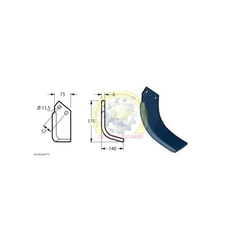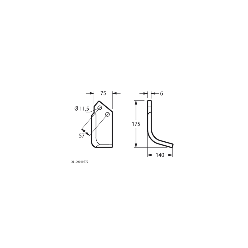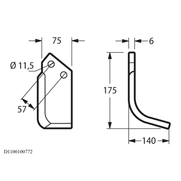 Zappa curva destra Diametro del foro 11.5 mm Interasse 57 mm Piatto 75x6 mm