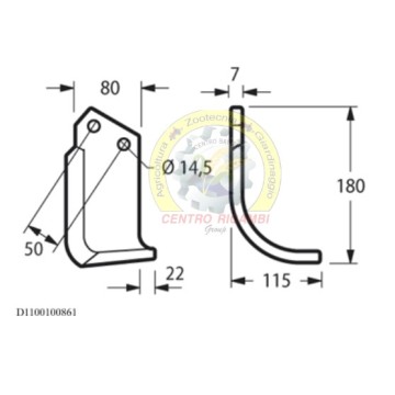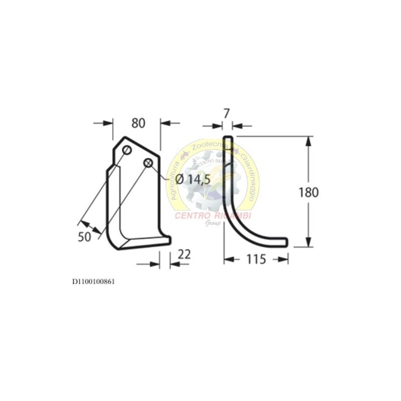 Zappa curva sinistra Lunghezza - X 115 mm Lunghezza - Y 180 mm Lunghezza - Z 22 mm Larghezza piatto 80 mm Spessore piatto 7 mmForma Curva Lato Sinistra Diametro del foro 14.5 mm Interasse 50 mm Altro lato D1100100862peso netto 0.9 kg adattabile aMeritano