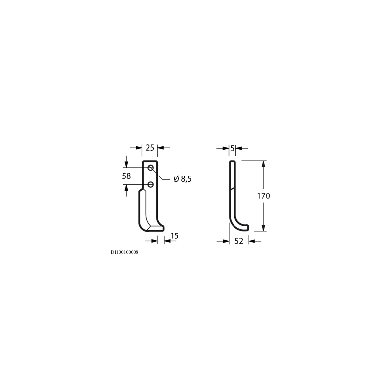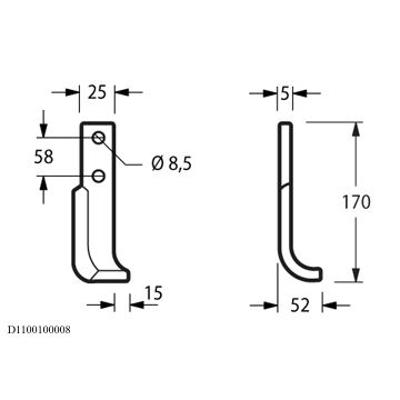 Zappa curva destra Diametro del foro 8.5 mm Interasse 58 mm Piatto 25x5 mm