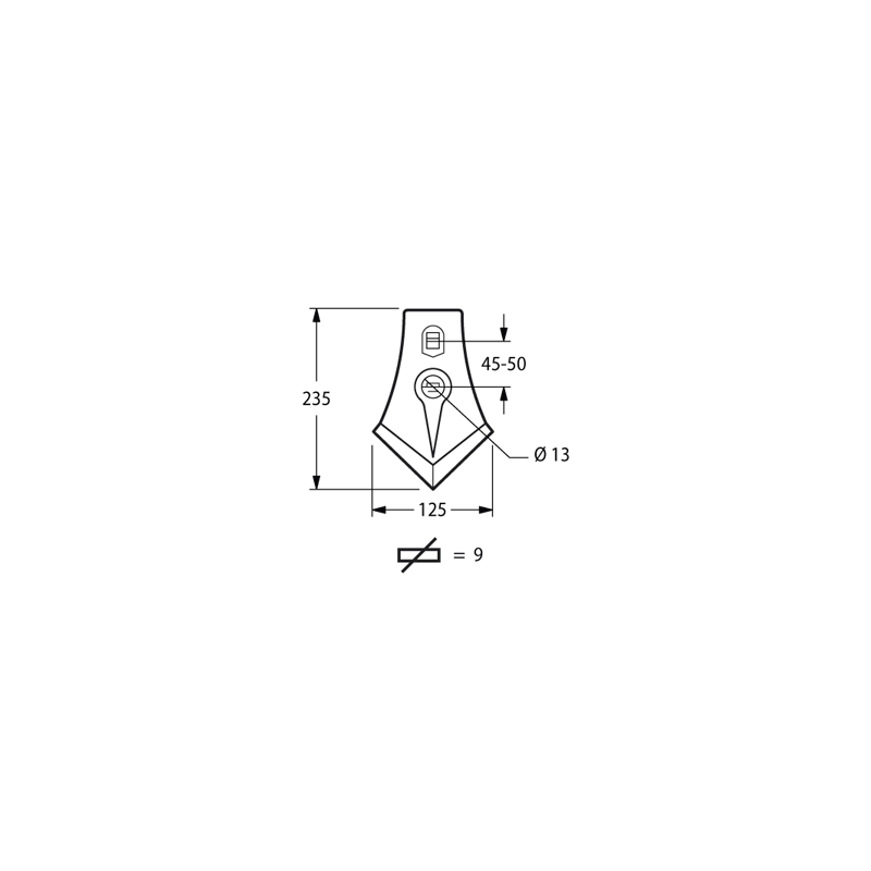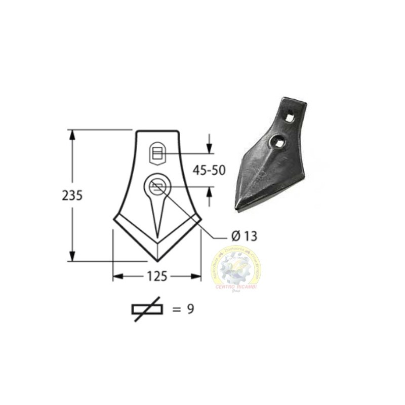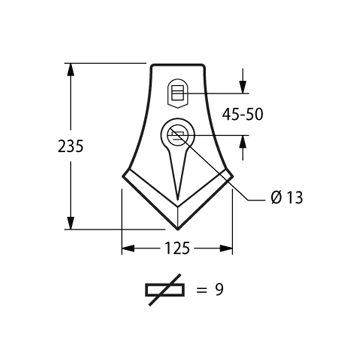 Vomerino a lancia per ancora estirpatore con foro ed asola Dimensione 120x230 mmvomere a lancia per ancora 120x230Ø foro 12 mm Interasse 45/50 mm AxB 120x230 mm peso netto 1.41 kg