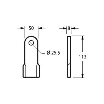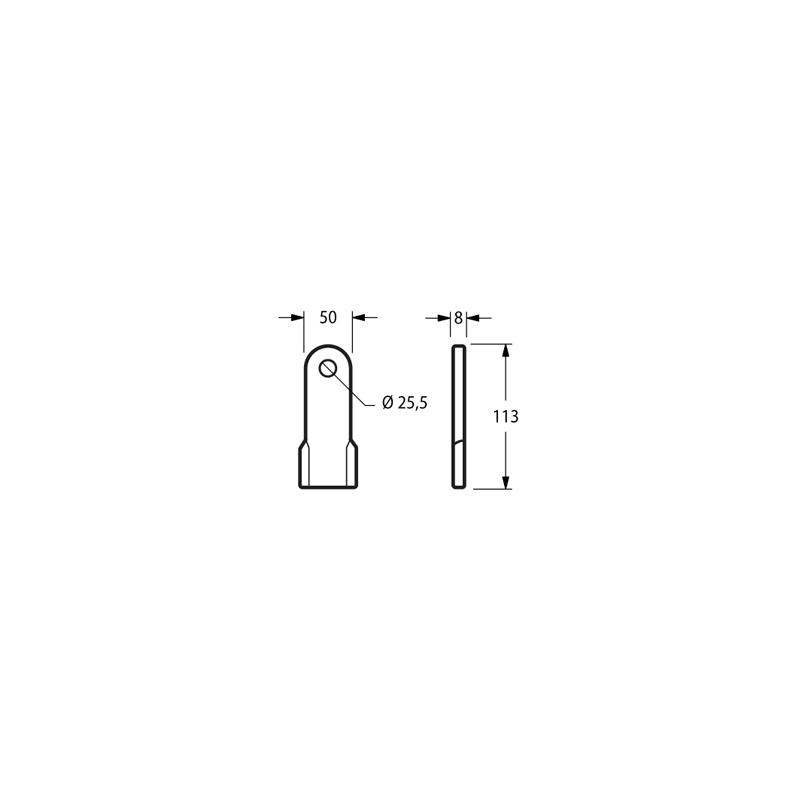 Coltello per trincia Foro 25.5 mm Piatto 50x8 mmLunghezza - LU 113 mm Altezza - LA 0 mmDiametro del foro 25.5 mm Larghezza piatto 50 mm Spessore piatto 8 mm Forma I peso netto 0.315 kg