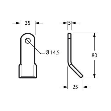 Coltello per trincia Foro 14.5 mm Piatto 35x5 mmOEM 00023013Lunghezza - LU 80 mm Altezza - LA 25 mm Diametro del foro 14.5 mm Larghezza piatto 35 mm Spessore piatto 5 mm Forma Y peso netto 0.11 kg