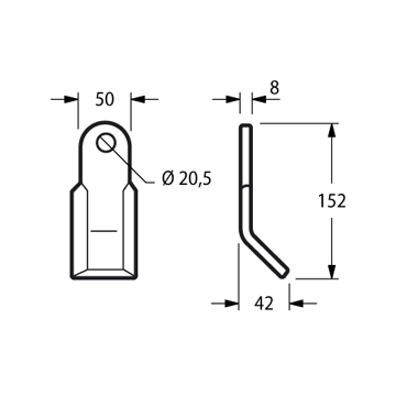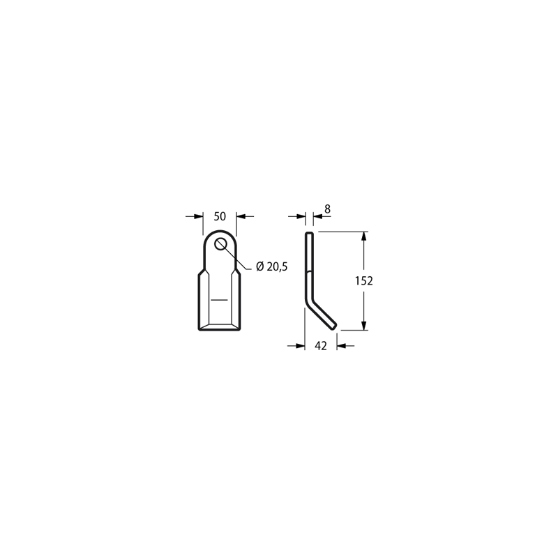 Coltello per trincia Foro 20.5 mm Piatto 50x8 mmLunghezza - LU 152 mm Altezza - LA 42 mm Diametro del foro 20.5 mm Larghezza piatto 50 mm Spessore piatto 8 mm Forma Ypeso netto 0.485 kg