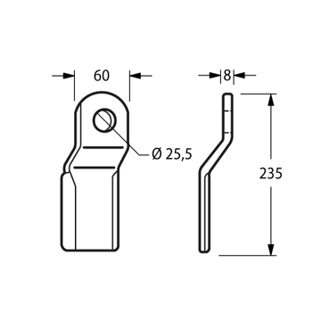 Coltello per trincia Foro 25.5 mm Piatto 60x8 mmLunghezza - LU 240 mm Altezza - LA 50 mm Diametro del foro 25.5 mm Larghezza piatto 60 mm Spessore piatto 8 mm Forma Z peso netto 0.835 kg