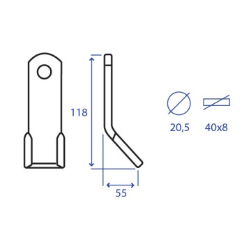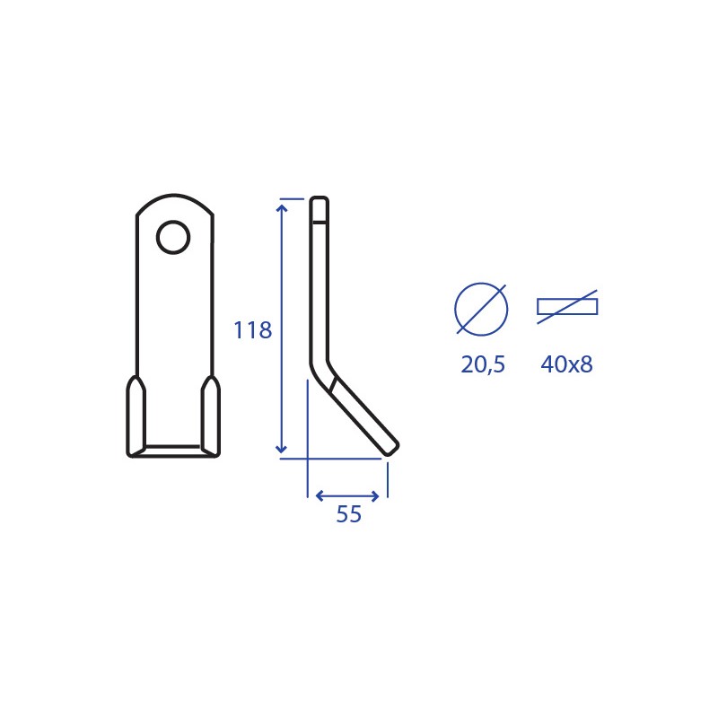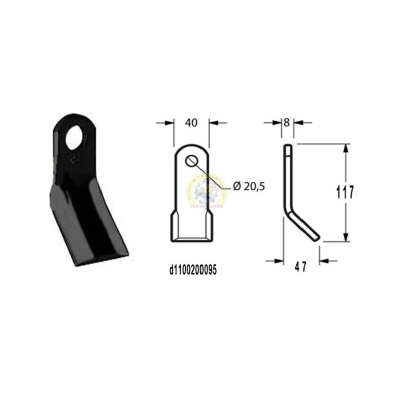 Coltello per trincia Foro 20.5 mm Piatto 40x8 mmOEM 00023004 3000323Lunghezza - LU 117 mm Altezza - LA 47 mm Diametro del foro 20.5 mm Larghezza piatto 40 mm Spessore piatto 8 mm Forma Y peso netto 0.29 kg
