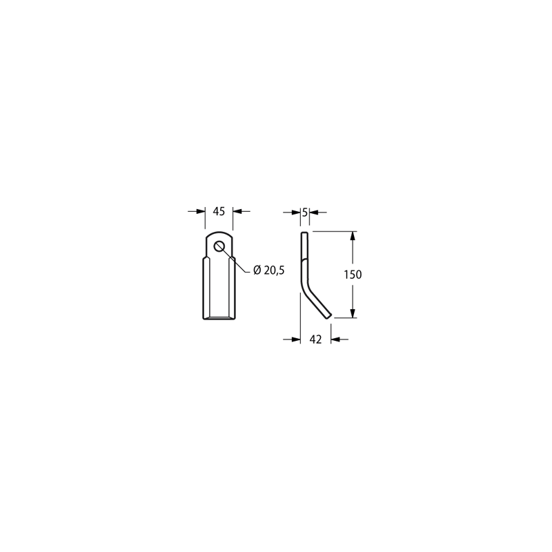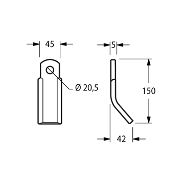 Coltello per trincia Foro 20.5 mm Piatto 45x5 mmADATTABILE BRUNILunghezza - LU 150 mm Altezza - LA 42 mm Diametro del foro 20.5 mmLarghezza piatto 45 mm.Spessore piatto 5 mm Forma Y peso netto 0.265 kg