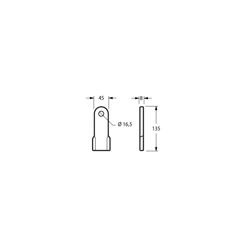 Coltello per trincia Foro 16.5 mm Piatto 45x8 mmADATTABILE MASCHIO dritto leggero - TERRANOVALunghezza - LU 135 mm Altezza - LA 0 mm Diametro del foro 16.5 mm Larghezza piatto 45 mm Spessore piatto 8 mm Forma I peso netto 0.335 kg