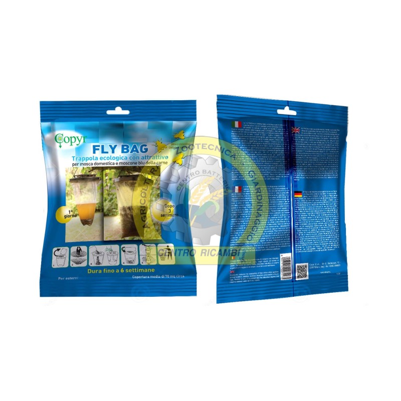 FLY BAG ?? un sistema facile ed ecologico (privo di insetticidi) per il monitoraggio delle mosche. Le mosche sono invitate ad entrare nella trappola e una volta entrate non hanno possibilit?? di uscita. Quando si attiva il monitoraggio? Il monitoraggio ?? attivo quasi da subito secondo istruzioni di seguito riportate; se il ritrovamento della mosche all'interno della trappola risulta elevato, si rende necessario porre ulteriori interventi di Integrated Pest Management.
